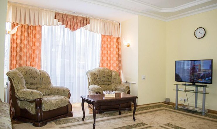 Sanatoriya mühafizə olunan yaşıl ərazidə yerləşir və liftlə təchiz olunmuş əsas 7 mərtəbəli bina, başqa 5 mərtəbəli yaşayış binası, otaqları olan üç ikimərtəbəli kottec, habelə yemək otağı və konfrans olan ayrı bina daxildir. otaq, əsas binaya bir keçidlə bağlıdır. Ayrıca sanatoriya ərazisində mineral bulaqlı bir nasos otağı var. 240 nəfər üçün nəzərdə tutulmuş mənzil fondu, tətilçilərə kotteclərdəki İqtisadiyyatdan tutmuş geniş otaqlara və mənzillərə qədər müxtəlif kateqoriyalı otaqlar təklif edir. Rahatlıq dərəcəsindən asılı olmayaraq hər otaqda vanna otağı, televizor və lazımi avadanlıq var. Superior otaqlar kondisioner və keyfiyyətli mebel ilə təchiz olunmuşdur. Qonaqların pəhriz yeməkləri də daxil olmaqla öz yeməklərini sifariş edə biləcəyi bir bar və yemək otağı var. Saunası və qapalı hovuzu olan hamam kompleksi təklif edir; İsti mövsümdə hər kəs yay açıq hovuzuna çıxa bilər. Aktiv həyat tərzi sevənlər üçün idman və fitness qurğuları, idman oyunları üçün oyun meydançaları, tennis kortu, su aerobikası və fitness dərsləri mütəmadi olaraq keçirilir. Axşamlar sanatoriyada asudə vaxt keçirilir - konsertlər, film nümayişləri, əyləncə proqramları və bilyard. Qonaqlar camaşırxana xidmətlərindən, simsiz internetdən və mühafizə olunan otoparkdan istifadə edə bilərlər. Uşaqlar üçün oyun otağı təşkil olunur, tərbiyəçilər işləyir.